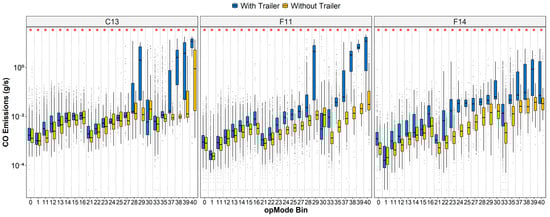 Comparison of CO emission rates (in log scale) at different opmode bins for tested trucks (C13, F11, F14) with and without trailer towing (statistically significant differences [p < 0.05] are indicated by *).