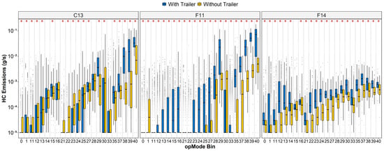Comparison of HC emission rates (in log scale) at different opmode bins for tested trucks (C13, F11, F14) with and without trailer towing (statistically significant differences [p < 0.05] are indicated by *).