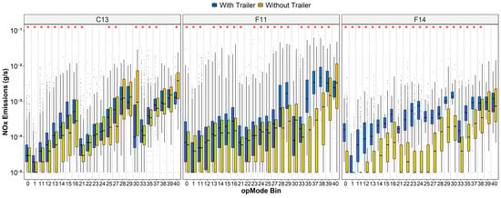 Comparison of NOx emission rates (in log scale) at different opmode bins for tested trucks (C13, F11, F14) with and without trailer towing (statistically significant differences [p < 0.05] are indicated by *).