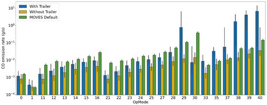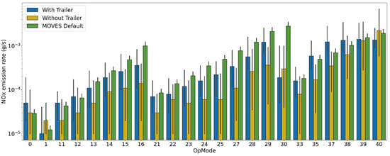 NOx emission rates showed less distinct trends compared to CO and HC, but still showed indications of elevated emissions compared to MOVES at the higher opmodes (bins 35–38), as shown in Figure 10 (see also Figure S3 for plot with NOx means and 95% confidence intervals). Overall, this study suggests that trailer-towing operations may result in higher emission rates (especially for CO and HC) when operating at higher opmodes. However, comparing to emission rates in MOVES may require further refinement to accurately reflect real-world conditions.
