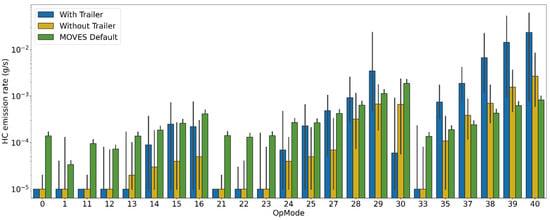 A similar trend is observed for HC emission rates, where test run data was below or similar to MOVES across the lower opmodes, but the higher-speed bins showed instances with noteworthy HC increases associated with trailer towing (roughly an order of magnitude increase compared to MOVES base rates), as shown in Figure 9 (see also Figure S2 for plot with HC means and 95% confidence intervals). There is also some indication that non-towing HC emissions were higher than MOVES base rates at the high-speed opmode bins, although to a lesser degree than towing emissions. This may indicate that MOVES default emission rates are more optimistic than the rates measured from the three tested vehicles. Also, as previously discussed, HC emissions data was often so low that it fell beneath the PEMS detection threshold (HC rates are shown as below detectable limit under 10−5 g/s).