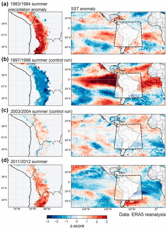 Hydroclimate and oceanic anomalies (z-scores) during the DJF periods selected for the simulation experiments: (a) precipitation and SST anomalies for the 1983/1984 summer; (b) same as (a) for the 1997/1998 summer (control run); (c) same as (a) for the 2003/2004 summer (control run); (d) same as (a) for the 2011/2012 summer. All anomalies are calculated as standard deviation units from the 1951–2021 mean (z-scores). The area marked by the dashed black lines denotes the simulation domain used in the modeling experiment. All data correspond to the ERA5 reanalysis dataset.