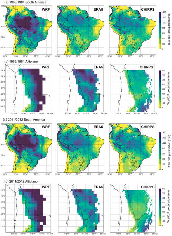 Upscaling and model validation. Comparison between the 1983/1984 and 2011/2012 summers in the WRF simulation, the ERA5 reanalysis, and the CHIRPS precipitation datasets. (a) Left panel: total precipitation for the initial DJF period in the WRF 1983/1984 simulation. Mid panel: total 1983/1984 DJF precipitation in the ERA5 reanalysis. Right panel: total 1983/1984 DJF precipitation in the CHIRPS dataset. (b) Same as (a) for the southern Altiplano; (c) same as (a) but for the 2011/2011 DJF simulation; (d) same as (c) but for the southern Altiplano.