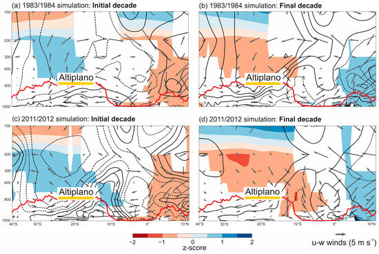 Pressure (hPa)–latitude cross-section with anomalies (z-scores) for specific humidity (colored), integrated vertical and meridional circulation (vectors), and zonal winds (contours) for the initial (years 1 to 10) and final (years 91 to 100) decades for the 1983/1984 and 2011/2012 simulations. The longitudinal means for all variables are calculated over the region, delimited by the red rectangles in Figure 5c,d. Anomalies in the pressure–latitude sections were calculated as standard deviations from the 100 yr means. Continuous (dashed) contours indicate westerly (easterly) zonal wind anomalies. The red line represents the profile of the maximum elevation of the Andes Cordillera, and the position of the Altiplano is marked in yellow. (a,b) First and final decade of the 1983/1984 simulation. (c,d) First and last decades of the 2011/2012 simulation.