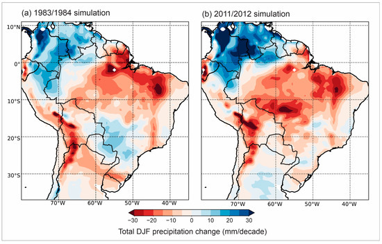 Total DJF precipitation trends (mm per decade) in South America for (a) the 1983/1984 and (b) 2011/2012 simulations. Trends are calculated using a linear regression for the entire 100 yr simulation period.
