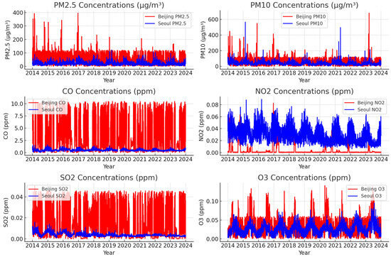 The data used in this study were collected from official air quality monitoring stations in Beijing and Seoul, spanning from 2014 to 2024. These cities were selected due to their significant air pollution issues and the availability of long-term air quality data. The monitoring stations in Beijing were operated by the Beijing Municipal Environmental Monitoring Center, and those in Seoul were operated by the Korean Ministry of Environment. The data collected includes daily concentrations of the following pollutants: PM2.5, PM10, NO2, SO2, CO, and O3. These pollutants were selected due to their significant impact on public health, environmental degradation, and their connections to urbanization and climate change [1,2].