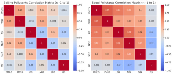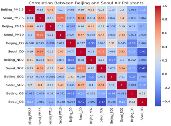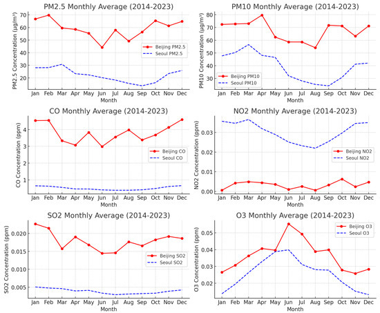 Air pollution continues to be one of the most significant environmental challenges globally, posing serious threats to public health, ecosystems, and climate stability. The impacts of air pollution are particularly pronounced in urban areas, where high population density, rapid industrialization, and increasing transportation contribute to the concentration of harmful pollutants. Urbanization, coupled with climate change, has further intensified the severity of air pollution in these regions, complicating efforts to regulate emissions and improve air quality. In East Asia, regions experiencing rapid economic development and urban expansion, such as Beijing and Seoul, are facing some of the highest levels of air pollution globally. These cities have long struggled with elevated concentrations of pollutants, including particulate matter (PM2.5, PM10), nitrogen dioxide (NO2), sulfur dioxide (SO2), carbon monoxide (CO), and ozone (O3), all of which have been linked to a range of severe health problems, including respiratory and cardiovascular diseases [1,2]. Additionally, these pollutants contribute to environmental degradation, including reduced visibility, ecosystem disruption, and negative effects on climate change [3].