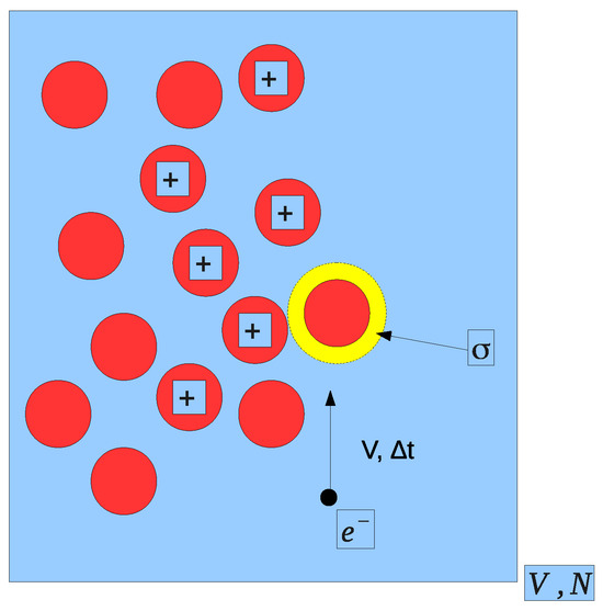 Geometric interpretation of electrons (small black circles) with velocity v colliding at air molecules (red circles) within a time step . The yellow area symbolizes the cross-section as a geometric interaction area (3).