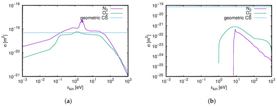 of two colliding bodies with radii and (Figure 2). For example, if we use the classical electron radius m and the van-der-Waals radius m for molecular nitrogen, the cross-section for electron scattering off is approximately . However, this definition is problematic as electrons and gas molecules are quantum particles. Hence, we cannot define a fixed radius for the interacting particles. Additionally, we cannot use such a geometric approach, but need to consider the scattering as a quantum process, where we have to consider electrons before scattering as a free wave, which is modified at the collision center (the molecule). Hence, cross-sections depend on the kinetic energy of electrons. As an example, Figure 3a shows the cross-section of the elastic scattering of electrons from air molecules [53]. It shows that the order of magnitude is indeed ≈, but that the cross-section actually depends on the electron energy, including resonances. Panel (b) shows an example of an excitation channel [53]. As aforementioned, excitations and ionization collisions require a minimum electron threshold energy. Hence, such cross-sections are only valid for larger energies.