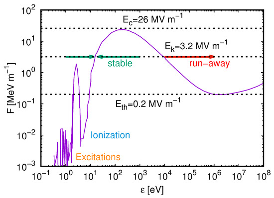 in principle allowing the analytic or numerical calculation of the average motion of an electron in a gas. However, this is a very simplified approach and only valid for the average motion since the friction force depends on the cross-sections (2), which—as aforementioned—reflects the quantum nature of electrons at air molecules. Hence, Equation (8) does not take into account the randomness of the electron–molecule collisions. Note that the force and the electric field are equivalent and only differ by a factor which is the elementary charge allowing the relating of the friction force to the electric field strength or vice versa. If , then there is a net acceleration/deceleration; if , electrons have reached an equilibrium point where their energy is conserved. As an example, let us apply a field of MV , which is the breakdown field at standard temperature and pressure in air (see Section 3.3), and let us start with electrons with an initial energy of ≈1 eV. Although there are electron–molecule collisions (with their quantum nature), there is a net acceleration, and electrons gain sufficient energies to excite or ionize air molecules. Although some of the electrons lose some of their energy, there is an overall acceleration. At approximately 20 eV, the electric force and the friction force reach an equilibrium point (indicated by the green lines), limiting the electron energy. Because of the random nature of collisions, some electrons might not collide and gain more energy. However, in this case, the friction force becomes larger than the electric force, decelerating electrons down to the equilibrium point. The maximum of the friction force in air occurs at approx. 100–200 eV, and one needs electric fields on the order of 8–9 to overcome this friction barrier; for larger energies, the friction decreases. This is what we call the runaway regime where electrons keep being accelerated systematically while their acceleration to higher energies is rather stochastic due to the quantum nature of collisions. Such electrons can almost reach the speed of light and are connected to high-energy phenomena, which is out of the scope of this paper.