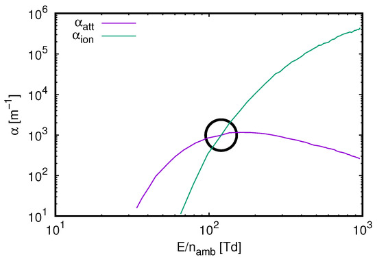 As Equation (10) indicates, the growth of electron avalanches and streamers depends on two competing processes, depending on the electric field: electron impact ionization liberating new electrons from the molecules and the attachment of electrons to air molecules. The equilibrium point