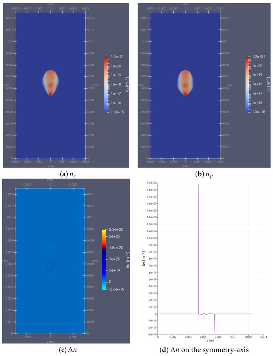 Streamers occur in two different polarities: negative and positive streamers. Negative streamers propagate through the electron motion out of the streamer head, against the direction of the electric field, hence towards the positive electrode (anode), which is very similar to what we discussed in Section 3.3, but now adding the effect of space charges. As mentioned before, the negative front mainly moves by electron impact ionization, multiplying the electron number and creating electron-ion pairs at the tip [1]. As the ions are much heavier than electrons, we can consider them immobile. These positive charges attract those electrons from the previous tip such that their charges partially cancel. In contrast, as the new electrons are much lighter than the ions, they drift outside of the streamer head and move towards the anode, leading to an excess of negative charge and thus forming the new tip of the negative streamer. Figure 7 sketches the density of electrons and positive ions as well as the charge difference ; note that the density of negative ions , originating from the attachment of electrons to gas molecules, is typically a few orders of magnitude less than the densities and . The figure indeed shows that inside the channel, the positive and negative charges mostly cancel each other, while at the tips, there is a small space charge layer at the tips that enhances the electric field at the tip. This elongates the discharge channel, and the process (electron impact ionization, neutralization of positive ions and the old tip electrons, and motion of new electrons to the anode) repeats, leading to the continuous growth of negative streamers. Note that although other processes (such as photoionization) mediate the motion and growth of negative streamers, the main process is electron impact ionization. Through the formation of new electrons at the tip, the space charge layer (Figure 7c,d) and thus the electric field at the streamer tip grow beyond the ambient electric field. In contrast, in the channel, the electric field is screened because of the similar amount of positive and negative charge (Figure 7).