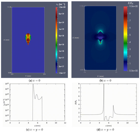 where , is the initial central height within the simulation domain, is the initial electron density, and the Gaussian decay length. Starting with (22) is a compromise between the computational burden to start with one single electron, developing into an electron avalanche and then streamer, and physical accuracy as the Gaussian (22) is designed such that it represents the size of the electron avalanche when the Raether-Meek criterion (13) is fulfilled, i.e., when the streamer regime starts [1,64]. The typical size of the patch is linked to the Raether-Meek criterion, the electron diffusion D, the electron mobility , the ambient electric field as well as to the ionization and attachment coefficients through [56,57,65]