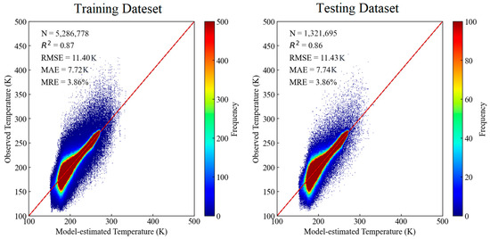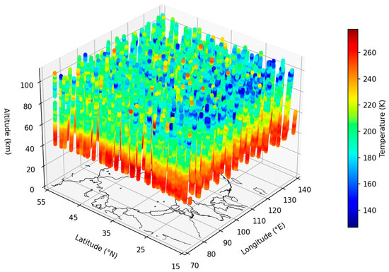 14]. Its key instruments include the Advanced Geosynchronous Radiation Imager (AGRI) for high-resolution visible and infrared imaging, the Geostationary Interferometric Infrared Sounder (GIIRS) for atmospheric temperature and humidity profiling, and the Lightning Mapping Imager (LMI) for detecting lightning flashes. In this study, the altitude, land type, and land–sea mask data from FY-4A are utilized to train our model, which has a spatial resolution of 4 km. The FY-4A-derived parameters (altitude, land type, and land–sea mask) serve as auxiliary features in the XGBoost model, providing geographical and topographical context that enhances temperature estimation accuracy. These parameters are used as training inputs for the model through a spatial collocation method, which identifies points geographically proximal to SABER observations in latitude–longitude space. More details about the input features are listed in