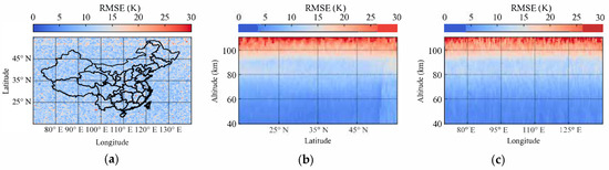 Figure 6, there is no evident trend with respect to latitude and longitude, with RMSE primarily remaining below 15. However, the situation differs at different altitudes: below 100 km, RMSE values are significantly lower than 15, while larger errors are observed above 100 km, where RMSE exceeds 20 and can even reach 30.