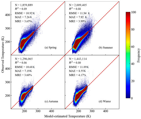We first examined the model’s predictions during the four seasons: spring, summer, autumn, and winter. The results indicated that the model performed at a consistently high level across all four seasons. In each season, the R2 value exceeded 0.8, and the RMSE remained below 12, demonstrating the model’s robustness. However, some differences were observed among the seasons. Spring and autumn exhibited relatively lower RMSE values, while spring and summer had higher R2 scores. Overall, winter had the weakest performance, while spring yielded the best results. This seasonal variation aligns with the temperature patterns, as spring and summer months typically experience higher temperatures compared to autumn and winter.