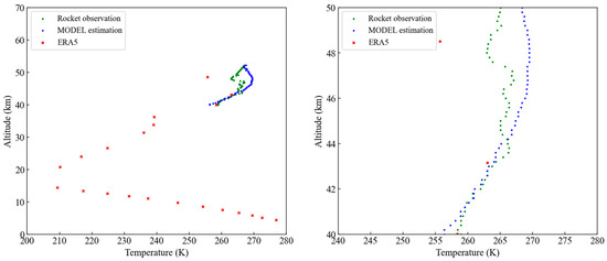 Figure 8 shows that the rocket-decocted profile (green dots) in Hainan aligns well with the model estimates (blue dots), particularly in the altitude range of 40 km to 45 km, where the error remains below 1 K. However, the error increases between 45 km and 50 km, which is characterized by an overestimation with a maximum deviation of approximately 8 K. At altitudes above 40 km, three sample points contained in the ERA5 datasets at 40 km, 44 km, and 48 km, respectively [