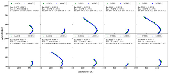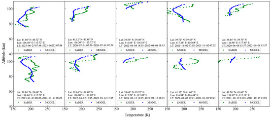 Temperature profiles over Beijing, which is defined by latitudes ranging from 39.4° N to 41.6° N and longitudes from 115.7° E to 117.4° E, obtained by SABER are used to assess the model’s performance at middle latitude in China. According to these geographical conditions, 116 profiles of SABER were identified. Then, we excluded the profiles with a sample number less than 20, and 104 profiles are ultimately selected, comprising a total of 9146 samples collected over five years. We also calculated the error for each profile and identified the ten worst and ten best profiles based on RMSE metrics, as illustrated in