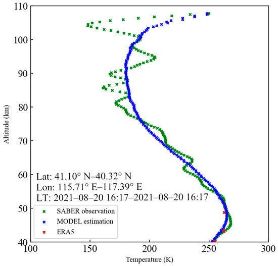 Figure 11 compares the specific profiles of temperature at 16:17 LT 20 August 2021, which are detected by SABER (green crosses), estimated by our model (blue crosses), and obtained from ERA5 dataset (red crosses), respectively. We can see that these three profiles are basically consistent with each other at below 50 km. It can be found that the vertical variation in temperature observed by SABER is generally consistent with that estimated by our model, with only the model estimation showing less small-scale structures. This suggests that the model established in our study is incapable of estimating the small-scale structures of the temperature, especially at above 80 km.