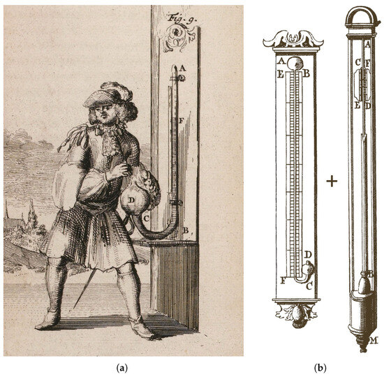 The air thermometer is very sensitive to the strong expansion that the air undergoes when it is heated, and Galileo’s thermoscope was based on this principle. The instrument was a kind of U-bend pressure gauge, with a flask containing air (which acted as a bulb), compressed by a column of mercury (Figure 2a). The use of thermoscopes in the 17th century is well documented in the literature, and images can be seen in meteorological treatises of the late 17th century. However, the readings were affected by the atmospheric pressure. At the beginning of the 18th century, two solutions were found to transform this device into a thermometer to obtain real temperature readings [20]. Amontons [25] established that the temperature was represented by the total height of the two mercury columns, i.e., it was sufficient to sum the column of the barometer and the column of the thermoscope. So, the Amontons thermometer was composed of two instruments: a thermoscope (improperly nicknamed ‘thermometer’) and a barometer, placed in proximity to it, as in Figure 2b [26]. In Bologna, Vittorio Francesco Stancari sealed the top of the thermometric tube to make it independent of atmospheric pressure [27,28]. Jacopo Bartolomeo Beccari and Gusmano Galeazzi used this instrument from 1715 to 1737, but then abandoned it, probably because it was damaged [29].