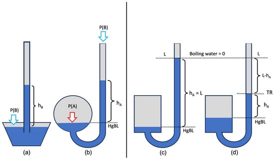 (a) Torricelli’s cistern barometer; height of the mercury column in the barometer; atmospheric pressure acting on the barometer and on the open tube of the Amontons thermoscope. (b) Amontons thermoscope; height of the mercury column; pressure exerted inside the flask of the thermoscope; HgBL baseline, which corresponds to the free surface of mercury. (c) Zendrini thermoscope at calibration. The level L reached by at boiling temperature was initially taken as a reference, with inverse scale. (d) Zendrini’s temperature readings are expressed as ; however, L, and HgBL are unknown.