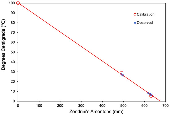 It should be noted that the intercept is 100.3 instead of 100 (0.3% departure) for the interpolation made with approximations (for instance, the point of boiling water may have been made at non-standard pressure). From Equation (3), the usual lower calibration point at melting ice can be calculated, i.e., °C at mm. Considering that the scale should include values below the freezing point, one should conclude that the total length of the tube, and the wooden tablet with the scale, should have been about 1 m long, or a little less.