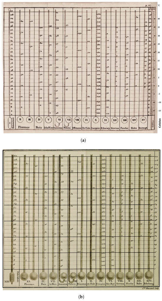 A very famous overview was published by Cotte in 1774 [41], which is almost identical to the previous one, but does not mention the Celsius scale (Figure 6b).