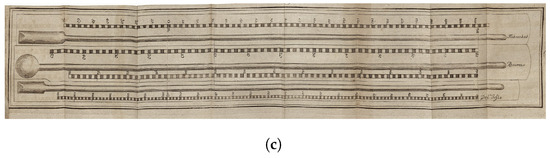 A third, specific overview including only Fahrenheit, both false and true Réaumur, and de l’Isle 0 °De at boiling water and 150 °De at melting ice was published by Kretzschmar in 1777 [42] (Figure 6c).