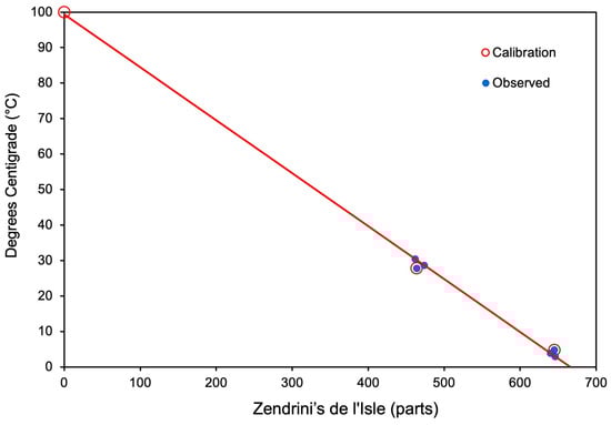 The thermometer built by de l’Isle in 1724 had the scale divided into 2400 or 2700 degrees °D to account for the low temperatures in St Petersburg. In 1738, Josias Weitbrecht recalibrated the thermometer for St Petersburg, with a second scale in degrees °De (to be distinguished from the previous ones in °D), with boiling water at 0 °De and the temperature of the cellars of Paris at 100 °De. Consequently, the melting ice was 150 °De [36,38]. The latter is known as the de l’Isle scale °De and was included in the overviews of the most used scales.