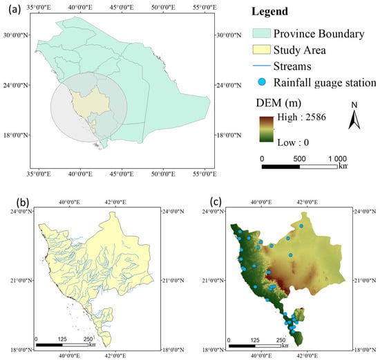 The (a) province boundary and study area, (b) stream network, and (c) DEM with gauge locations.