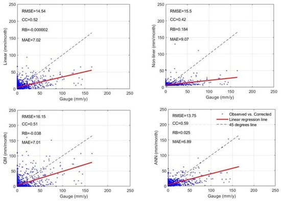 Scatter plots of different correction methods (linear, nonlinear, QM and ANN) compared to the observed data.
