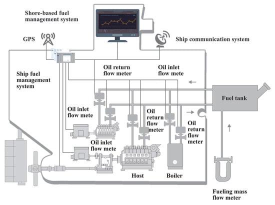 This method can record the real-time fuel consumption of the ship accurately during different time periods for different emission sources by installing flow meters at the inlet and outlet of the pipeline (shown in Figure 1) and calculate the carbon emissions in this way. The flow meters for applicable combustion processes play an important role in international shipping carbon-emission verification rules; they help shipping companies to conduct the refined management of energy consumption, evaluate the energy efficiency of the equipment, and meet the requirements of IMO and EU for the carbon-emission monitoring, reporting, and verification of ships. The formula is as follows: