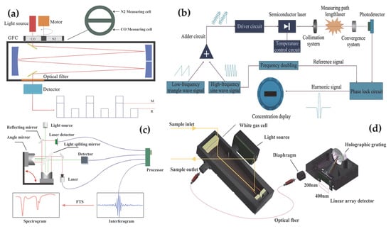 Principle of direct carbon-emission monitoring technology, (a) Non-Dispersive Infrared; (b) Tunable Diode Laser Absorption Spectroscopy; (c) Fourier Transform Infrared Spectroscopy; (d) Ultraviolet Differential Optical Absorption Spectroscopy.