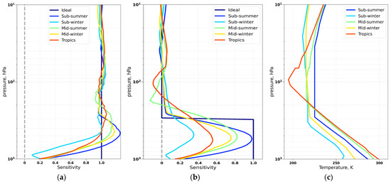 The sensitivity of the IKFS-2 spectral measurements to the variability of the TOCs (a) and TrOCs below 300 hPa (b) for different atmospheric climate models. The navy line shows the ideal sensitivity. Temperature profiles of different atmospheric climate models (c).