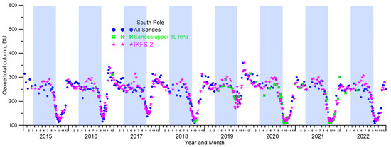 Figure 3, Figure 4 and Figure 5 depict the TOCs from sondes and IKFS-2 data in the area of both poles and the tropical zone. Only some of the ozonesondes ascended to the 10 hPa level, which is determined by the balloon quality and weather conditions. Therefore, we highlighted in the figures the data obtained at the probe ascent above the 10 hPa level.