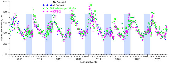 TOCs from ozonesonde data at Ny-Alesund station (79° N) and daily TOCs of IKFS-2 at a distance of 70 km. The polar night periods are highlighted in colour.