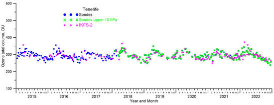 TOCs from ozonesonde data at Tenerife station (28° N) and daily TOCs of IKFS-2 at a distance of 70 km.