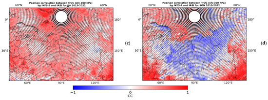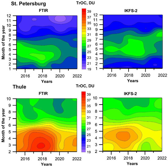 The examples of temporal variability of TrOCs derived from IKFS-2 and FTIR instruments for St. Petersburg (in the surface to 400 hPa layer) and Thule (from the surface to 300 hPa layer) sites are depicted in Figure 6. In general, IKFS-2 measurements reproduce the year-to-year variability detected from ground-based measurements well. For the tropospheric layer up to 400 hPa (St. Petersburg site), the IKFS-2 TrOC maximum is shifted from the spring to summer months. The same feature is observed for comparison between IASI and FTIR measurements [52,54].