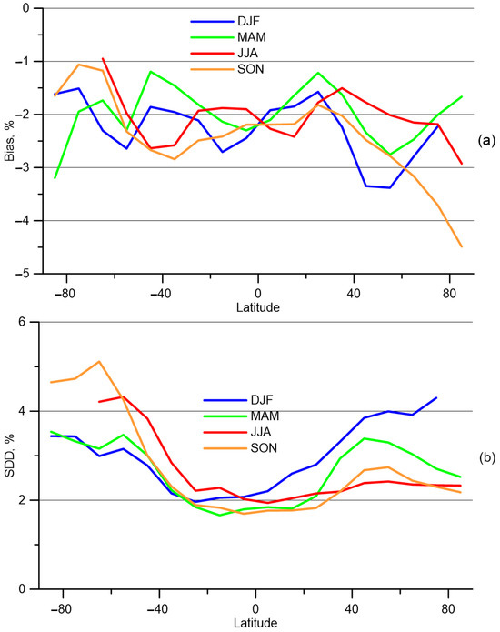 Row 1 of Table 2 presents the same results found in [66], but uses updated and supplemented independent data for comparisons. The values presented in row 1 of Table 2 differ slightly from the results of [66], where SDD was 2.9% for ground-based measurements and 2.75% for satellite measurements. The changes are due to their replenishment: TOCs at ground-based WOUDC stations are retrieved gradually over several years after the actual measurements of solar irradiance. Changes in differences for TROPOMI data are due to the replacement of preliminary OFFL versions of the processing with the final RPRO version.
