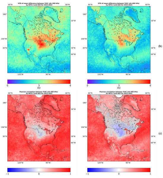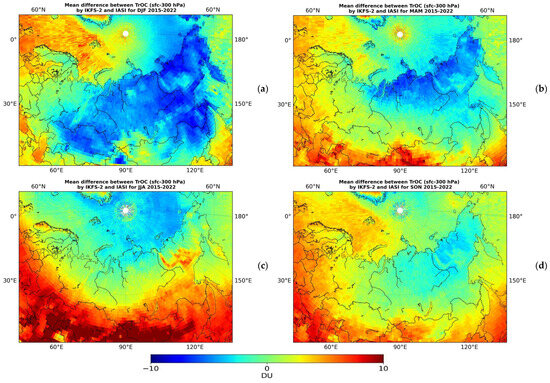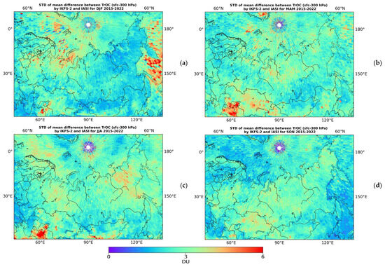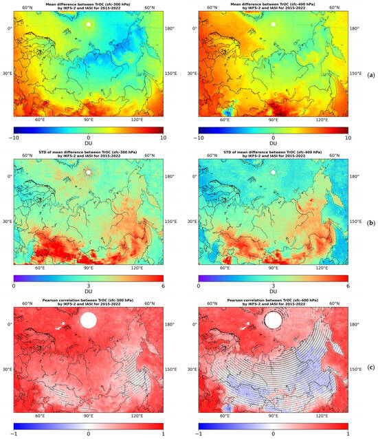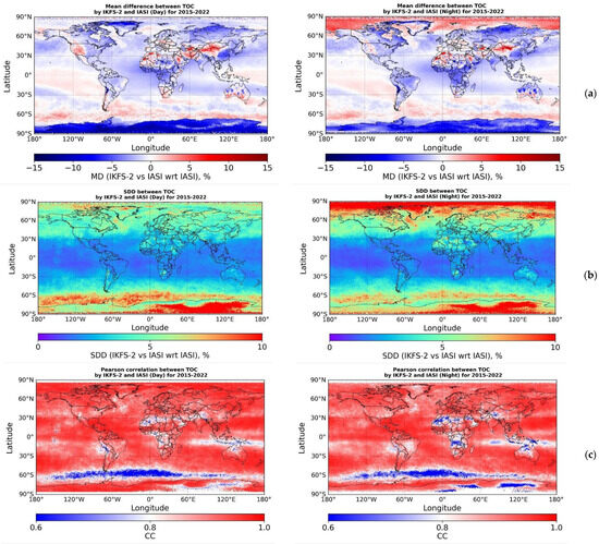 For comparisons, we used the results of independent TOC measurements by two other satellite instruments—TROPOMI and IASI. In May 2018, TROPOMI started TOC measurements on board the Sentinel 5 Precursor (S5P) satellite [18]. The spatial resolution of the instrument varies from 3.5 × 7 km [48] to 3.5 × 5.5 km [49]. Garane et al. [48] compared TOC data retrieved from TROPOMI with ground-based measurements by the Brewer, Dobson, and Differential Optical Absorption Spectroscopy (DOAS) instruments. Mean differences (MDs) ranged from 0 to 1.5%, with the standard deviation of the differences (SDDs) ranging from 2.5 to 4.5%. For TOC IKFS-2 validation, we used TROPOMI level 2 measurements [49], with a quality flag of at least 0.9. We used RPRO (reprocessed version) before and OFFL (results of the first offline processing) data after 26 August 2022, with data available on 5 March 2024. For comparison, we took TROPOMI and IKFS-2 TOC data pairs with 35 km and 6 h mismatch. Due to the orbital characteristics of two satellites, smaller time mismatches preclude comparison in the tropics and mid-latitudes. To exclude implausible TOC values, we limited TROPOMI data in the range of 100–650 DU.