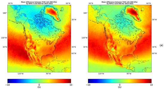The smallest bias between satellite and ground-based measurements is observed for the Thule, St. Petersburg, and Tsukuba sites. In general, IKFS-2 and FTIR TrOCs correlate better and have a larger bias for a thicker layer—from surface to 300 hPa. The positive bias with ground-based measurements for mountain sites is explained by the ozone content in additional tropospheric layers for satellite measurements. For example, we receive ~8 DU mean difference for the Izaña site, which is very close to the difference between IASI and FTIR measurements for the same site [53], and which is recommended to be added to FTIR measurements based on the comparison of ozonesonde profiles launched at the site altitude and the sea level [60].