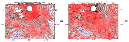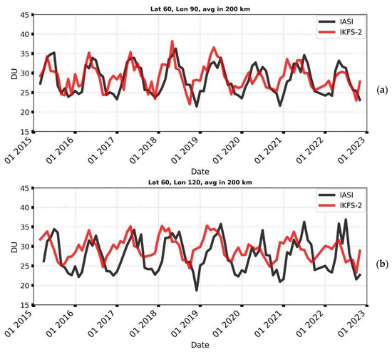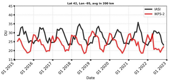 Another satellite instrument, IASI [50], whose data were used to compare both the TOC and the TrOC results with those of IKFS-2, is quite like IKFS-2. The global TOC and TrOC datasets are based on IASI observations from the EUMETSAT MetOp-A, -B, and -C satellites (https://user.eumetsat.int/data/satellites/metop/data, accessed on 1 December 2022). We used MetOp-A and MetOp-B data because MetOp-C was launched later than IKFS-2. MetOp satellites operate in a sun-synchronous orbit with 07:50 and 9:31 local time of descending node equatorial crossing time for MetOp-A and MetOp-B, respectively. Spatial resolution of measurements constitutes 12 km. The main purpose of the instrument is temperature and humidity profile measurements, and as with IKFS-2, the IASI spectral region includes the 9.6 µm ozone absorption band, which provides information about ozone.