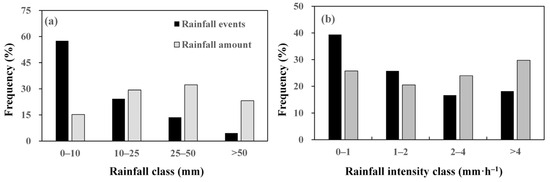 Frequency distributions of the amount (a) and intensity (b) of rainfall during the experimental periods.