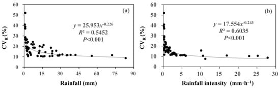 The variation coefficient of throughfall at individual rainfall events (throughfall CVR) derived from all 50 collectors, ranged from 8.8% to 52.0%, with an average of 18.1% ± 8.2% (mean ± SD). Throughfall CVR showed a large variability when rainfall was less than 5 mm. We further analyzed the effect of rainfall characteristics on the spatial variability of throughfall, and found that there was a significant power functional relationship between throughfall CVR and rainfall amount. The throughfall CVR first sharply decreased with the increasing gross rainfall, and gradually stabilized at larger rainfall event (Figure 6a). Similarly, the rainfall intensity had a power functional relationship with the spatial variability of throughfall, and the throughfall CVR first sharply decreased with the increasing rainfall intensity, and gradually stabilized at heavy rainfall intensity (Figure 6b).