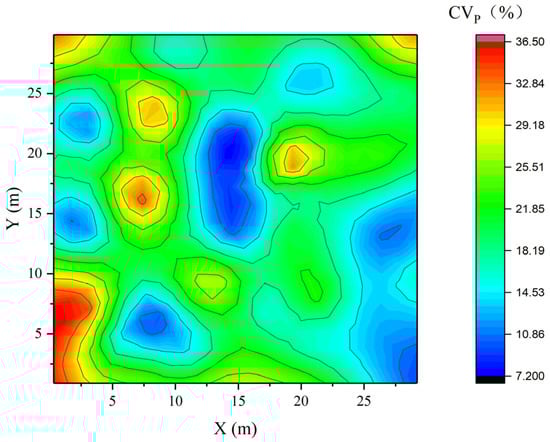 The variation coefficient of throughfall for 66 rainfall events at each individual collector (throughfall CVP) is shown in Figure 7. During the observation period, the throughfall CVP value of 50 throughfall collectors ranged from 9.5% to 35.3%, and the average value is 19.5% ± 6.8% (mean ± SD). During the study period, the value of global Moran’s I of throughfall CVP was 0.05 and p = 0.58, indicating that the spatial autocorrelation of the throughfall CVP was not significant, and the spatial distribution of variation coefficient of throughfall in the experimental plot was random.