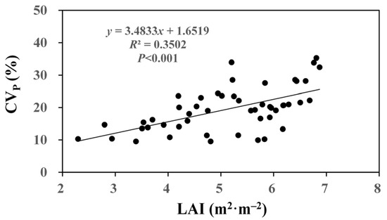 We found that the spatial distribution of throughfall CVP was generally consistent with the distribution of the trees (Figure 2), that is, the throughfall CVP is relatively higher in dense bamboo forest areas compared to sparse bamboo forest areas, where it is comparatively lower. To verify this point, we analyzed the relationship between LAI and throughfall CVP at each collector. The result indicated that LAI had a significant positive correlation with throughfall CVP, and throughfall variation increased with the increasing LAI (Figure 8).