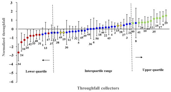 Time stability plot of normalized throughfall for the Moso bamboo stand. The upper and lower error whiskers represent the 95% confidence interval. Red solid circles: extreme dry persistent collectors; green solid circles: extreme wet persistent collectors; yellow solid circles: general persistent collectors; blue solid circles: unstable persistence collectors. The numbers in the plot are the throughfall collectors in Figure 2.