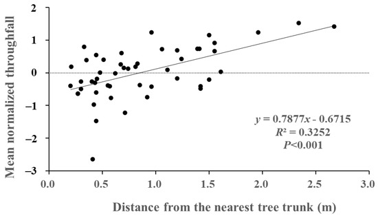 The relationship between the mean normalized throughfall (i) and distance from the nearest trunk was investigated (Figure 10). There was a significant positive correlation in the Moso bamboo forest (p < 0.001). Additionally, the observations indicated a zone of obviously lower throughfall (i < 0) within 0.5 m of trees in the stand, while higher throughfall (i > 0) increased when the distance from the nearest trunk was more than 1.0 m. In consideration of the temporal persistence and position of throughfall collectors (Figure 2 and Figure 9), the dry persistent collectors were mostly adjacent to the tree stems (e.g., collectors 34, 24, 20, 42, 48, and 31). Meanwhile, the wet persistent collectors were far from the tree stems (e.g., collectors 10, 11, 35, 25, 17, 9, and 29).