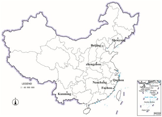 Soil chemical properties at Shenyang, Beijing, Zhengzhou, Nanchang, Quzhou, Fuzhou, and Kunming sites. Vertical bars represent the standard deviations of the mean (n = 3). Different letters above bars indicate significant differences (p < 0.05).