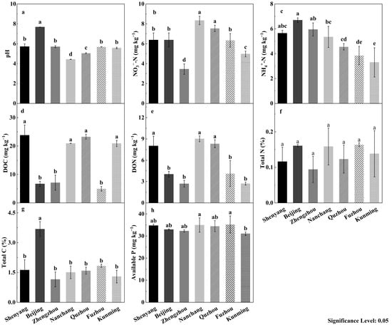 Soil chemical properties exhibited significant variation (Figure 2). pH ranges from 4.4 (Nanchang, lowest) to 7.6 (Beijing, highest). Nitrogen showed distinct patterns; NO3−-N content varied between 3.4 mg kg−1 (Zhengzhou) and 8.3 mg kg−1 (Nanchang); NH4+-N levels spanned 3.3 mg kg−1 (Kunming) to 6.7 mg kg−1 (Beijing); Total nitrogen (TN) ranged from 0.09% to 0.16%, with Fuzhou significantly higher than other sites. Dissolved organic nitrogen (DON) varied between 2.6 mg kg−1 (Zhengzhou) and 9.0 mg kg−1 (Nanchang). Dissolved organic carbon (DOC) ranged from 4.9 mg kg−1 (Fuzhou) to 23.8 mg kg−1 (Shenyang). Total carbon (TC) peaked in Beijing (3.6%) and reached its minimum in Zhengzhou (1.1%). Available phosphorus (AP) showed limited spatial variation, maintaining consistent levels across regions (31.0–35.2 mg kg−1).